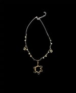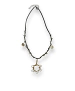 Made using tarnish resistant gold color copper wire, thrifted pearl beads, and waxed necklace cord. Adjustable from 18” in. to 22” in.
