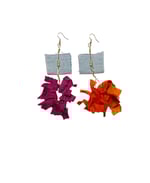 Made using thrifted denim jeans, thrifted colorful cotton fabric, thrifted pearl beads, nickel free gold plated over brass earring findings, and tarnish resistant wire gold over copper.
